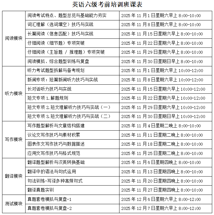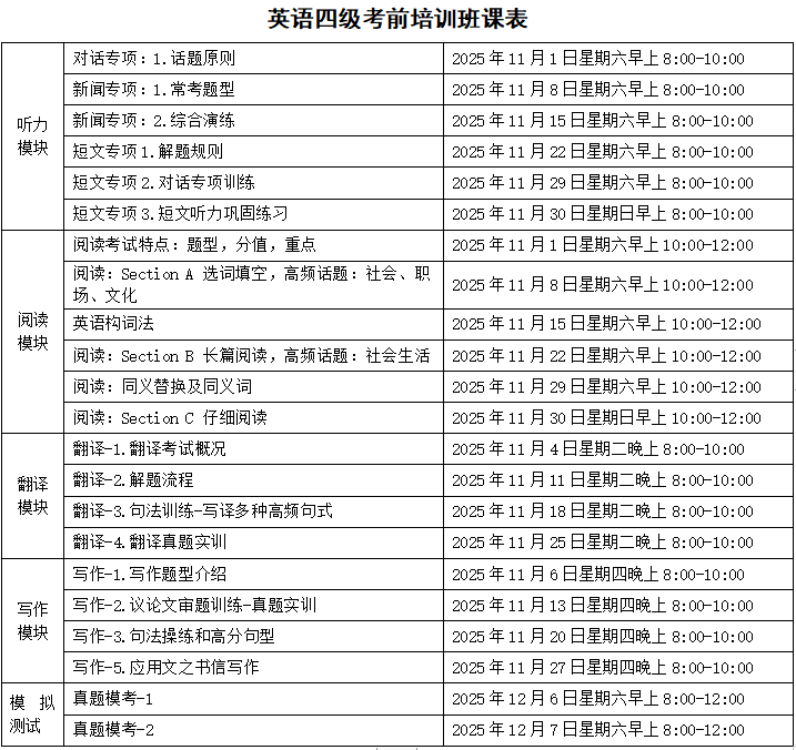 英语作为国际交流的重要工具,在教育和职业发展中扮演着越来越重要的角色。大学英语四、六级考试(CET-4/6)不仅是衡量大学生英语水平的重要标准,也是许多企事业单位招聘时参考的重要指标之一。 为帮助广大学生顺利通过大学英语四、六级考试,提升英语综合应用能力,球速体育足球特别推出“大学英语四、六级考前培训班”。该项目旨在为应考学生提供系统化、个性化的学习方案,为顺利通过考试助力。 【培训目标】 帮助学员掌握大学英语四、六级考试的核心知识点和解题技巧。 提升学员在听力、阅读、写作及翻译等各方面的应试能力。 助力学员备考大学英语四、六级,取得理想成绩。 【培训内容】 听力专项:强化训练,习得技巧,提升分数 阅读专项:打破传统,掌握方法,争取高分 写作专项:活用模板,巧用句型,优化结构 翻译专项:逻辑转换,转变思维,着重产出 测试点评:全真试题,定位短板,科学提升 【培训对象】 1.广西大学在读本科生和研究生; 2.南宁市内高校在读本专科生和研究生。 【培训方式】 线上线下混合教学:线上平台提供丰富的教学资源,方便学员随时复习和练习重点知识;线下课堂开展面授教学,包括知识点讲解、小组讨论、课堂练习等。 小班教学:每班学员控制在30人左右,确保教师能够关注到每位学员的学习情况,提供个性化指导。 【培训时间】 培训周期为5周,共48个课时,每次课50分钟。课程主要安排在周末及课余时间。计划2025年11月1日开课,12月7日结课。 【收费标准】 大学英语四级考前培训班:1580元/人/期。 大学英语六级考前培训班:1880元/人/期。 【联系方式】 咨询报名热线:0771-3235605 李老师 报名地址:球速体育足球210办公室 咨询二维码 报名二维码