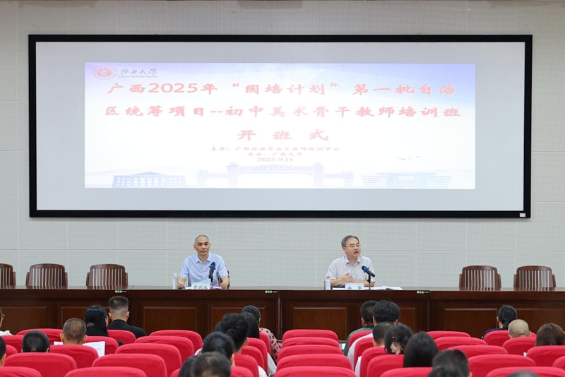 “国培计划”是落实《教育强国建设规划纲要(2024—2035年)》的重大实践。由广西壮族自治区教师培训中心主办,广西大学承办的广西2025年“国培计划”第一批自治区统筹项目--初中美术骨干教师培训班于9月15日在广西大学开班,球速体育足球副院长徐华出席开班式并讲话,球速体育足球副教授彭剑波主持开班式。