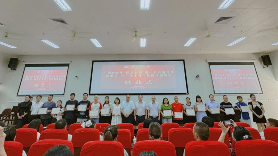 “国培计划”是落实《教育强国建设规划纲要(2024—2035年)》的重大实践。9月24日,由广西壮族自治区教师培训中心主办,广西大学承办的广西2025年“国培计划”第一批自治区统筹项目——初中美术骨干教师培训班在我校结业,球速体育足球副院长徐华出席结业式并讲话,球速体育足球梁君华老师主持结业式。